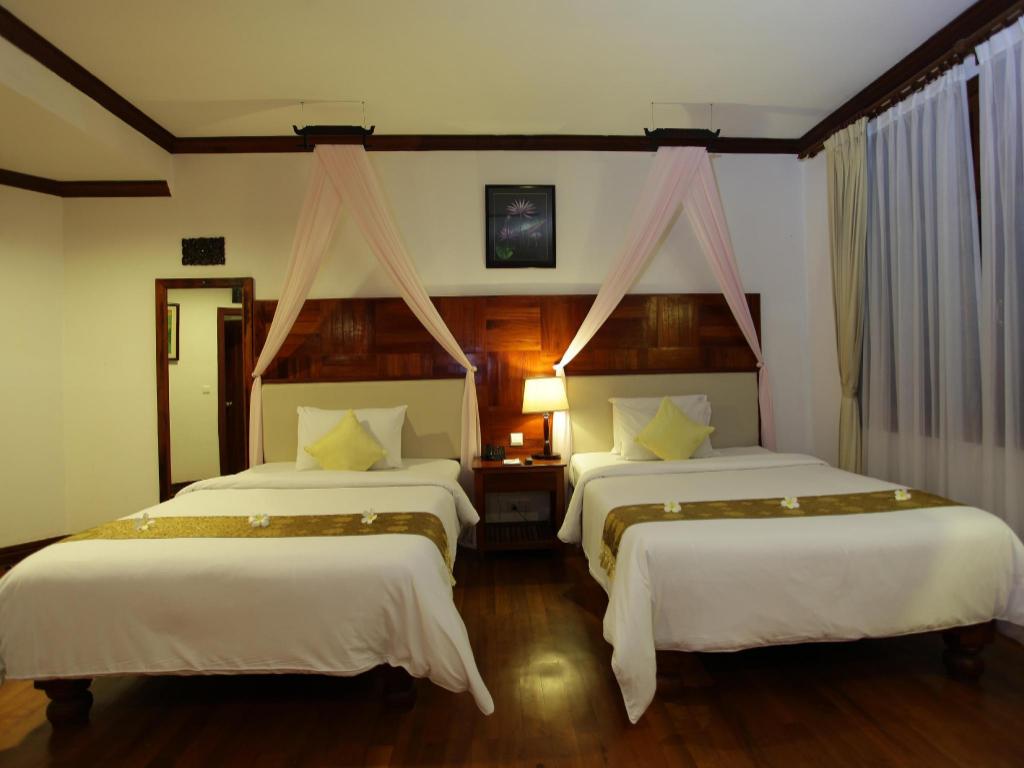 Offering easy access to the pool, this traditional wooden Khmer-style villa features a flat-screen TV, Cambodian silk and cotton and a seating area.